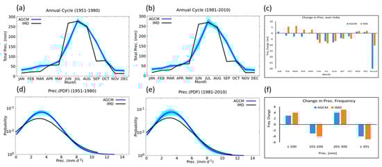 The annual cycles and frequency distributions from monthly precipitation climatologies over India during 1951–1980 and 1981–2010 are depicted in Figure 8. Results indicate that India receives the highest amount of precipitations in July and August months (~275 mm and ~245 mm respectively) and lowest amounts from November to May (about 50 mm or less). Both AGCM model and IMD observation shows the same features. Each ensemble member also shows similar characteristics (Figure 8a,b). Overall, the precipitation amounts in all the months except June and September in the model simulation have a good agreement with those of observation. The model simulated precipitation amount for June month is underestimated, while it is overestimated for September. However, it is noticed that underestimated amount in June and overestimated amount in September are almost the same. This indicates that the model reproduced the total precipitation reasonably well during the Indian monsoon (June–July–August–September). Comparison between the monthly precipitation amounts in two climate periods indicate that the precipitation amounts over India in recent climate period are decreased for the months June through October and increased for the months November through January and May (Figure 8c). IMD observation shows an increase of precipitation amounts during February–April, while model could not capture this trend and shows a decrease of precipitation.