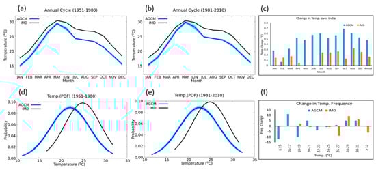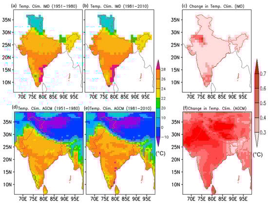 Temperature climatology in two climate periods from (a,b) AGCM ensemble and (d,e) IMD observation. Change in temperature climatology from (c) IMD and (f) AGCM.