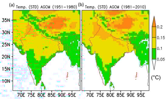 Standard deviation of the temperature climatologies derived from all ensemble members in two climate periods (a) 1951–1980 and (b) 1981–2010.