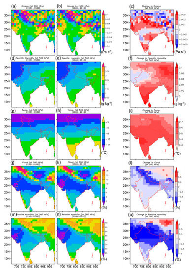 The climatology of precipitation indicated a decrease of precipitation amount in recent climate period. Previous studies (e.g., [11,14]) also observed negative precipitation trends over various regions of India. To understand the mechanism of decreased precipitation, we analyzed the vertical velocity (Omega), specific humidity, upper air temperature, cloud and relative humidity at 500 hPa during two climate periods and their changes in recent climate period (Figure 12). We find that the omega is higher in the recent climate period (i.e., 1981–2010) over Indian regions, implying relatively weaker upward motion of air compared to that during 1951–1980 (Figure 12c). Specific humidity and temperature at 500 hPa are increased in recent climate over almost entire Indian regions except western regions (specific humidity decreased) (Figure 12f,j). Cloud and relative humidity are also decreased in recent climate period over entire Indian regions (Figure 12l,o). All these implies that the decrease of relative humidity and cloud together with weaker vertical velocity could be the reason of decrease of precipitation over Indian region in recent climate period. Although an increase of specific humidity and temperature are noticed over most of the regions, but water vapor could saturate enough due to lower percentage of humidity. We further found that temperature is increased over entire regions of India in recent climate period. Multitudes of previous studies (e.g., [17,20,47,48,49]) also highlighted an increase of temperature trends over Indian regions. The reason could be associated with many factors such as increase of greenhouse gas concentrations in the air, land use changes, human activities. There are plenty of debate in this context and can be found in IPCC reports [1,2].