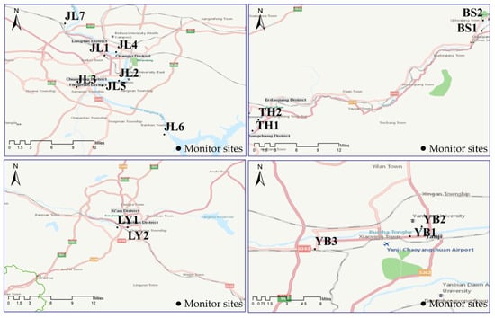 This study used the mass concentrations of six conventional pollutants (PM2.5, PM10, CO, SO2, NO2, and O3) from 2 January 2015 to 31 December 2020, from 16 air quality monitoring stations in the eastern part of Jilin Province (Figure 1). The specific information of 16 air quality monitoring stations is shown in Table 2. The particular locations of the 16 monitoring stations are shown in Figure 2. 48i, 49iQ, 43iQ, 42iQ, and 5030i of Thermo Scientific equipment were used to monitor CO, O3, SO2, NO2, and PM2.5/PM10, respectively. Hourly monitoring data were used for the analysis of six pollutants. In this paper, all data were preprocessed according to the “Monitoring Regulation for Ambient Air Quality” (HJ/T193-2005) to eliminate spatial and temporal outliers and ensure data quality []. Spring was defined as March, April, and May. Summer was defined as June, July, and August. Autumn was defined as September, October, and November. Winter was defined as December, January, and February. According to the notice on holiday arrangement issued by the general office of the State Council, the 16–19 years were divided into working days and holidays for “weekend effect” analysis.