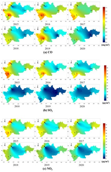 Based on the pollutant concentrations observed at 16 monitoring stations, the Kriging interpolation method in Surfer software (Golden Software, Golden, CO, USA) was used to draw the contour map of six kinds of pollutant concentrations in the study area over 6 years. Because the distribution of sampling points is discrete and the sample data obtained is limited, it cannot show the distribution state of pollutants in the whole region, and the Kriging interpolation algorithm can adequately solve the assignment problem from point to surface. Kriging interpolation uses the distance and spatial direction between known sample points to reflect the spatial correlation and makes a linear unbiased optimal prediction for the unknown points []. However, Kriging interpolation is an inverse distance interpolation method, so the distance and density between monitoring points will affect the model’s accuracy. For example, the distance between some monitoring points in this study was far, which increased the gap between the simulated value and the actual value to a certain extent. The spatial changes in six pollutants were analyzed according to the image. At the same time, the annual average concentrations of six pollutants in six years were calculated, and we explored the difference in pollutant concentration between years.
