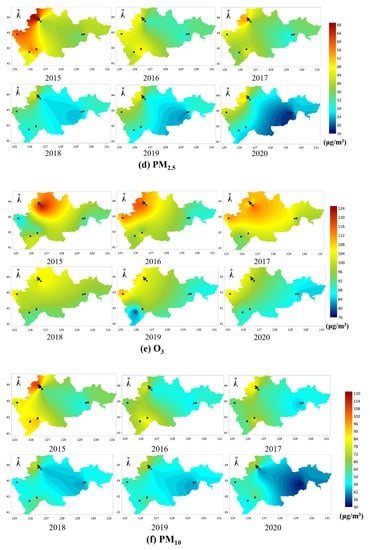 Spatial distribution of annual average concentrations of six pollutants in the eastern Jilin Province, China, from 2015 to 2020. (a) CO unit: mg/m3; (b) SO2 unit: μg/m3; (c) NO2 unit: μg/m3; (d) PM2.5 unit: μg/m3; (e) O3 unit: μg/m3; (f) PM10 unit: μg/m3. (The black dot on the figure is the position of the monitoring point).