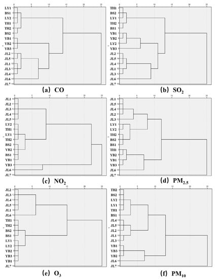 We used the Ward1 method in SPSS to cluster 16 monitoring points, and the results are shown in Figure 4. We found a fascinating phenomenon: most sites complied with the spatial distribution results, but JL6 and JL7 sites were always not crowded with other JL sites. The JL7 site was notable because the JL7 site was located at the northernmost end of Jilin City. It is an emerging industrial park. More than a dozen large and small chemical enterprises are in the park, which led to JL7 being divided into one category alone. Taking the cluster analysis of PM2.5 as an example, the JL6 site was not classified with other JL sites but with the YB1-3 sites. This was because the JL6 site was located in the tourist area of Jilin City, only surrounded by some sanatoriums and a small number of residential areas. Its south was Songhua Lake’s scenic spot. As shown in Figure 2, the JL6 site was a scenic spot in Jilin City. It is subject to more strict pollutant control and has no industrial emissions and severe traffic pollution. Therefore, the concentration of various pollutants was low, resulting in the specific particularity of the JL6 site and clustering with the YB site with the same low pollutant concentration.