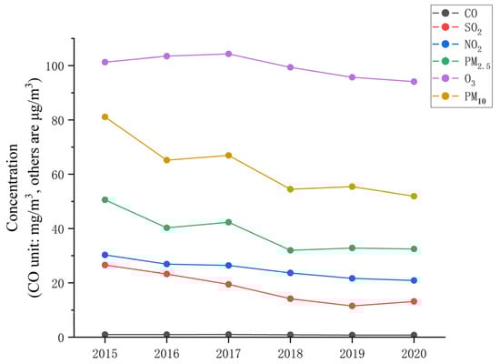 Change trend in annual average concentrations of six pollutants (CO, SO2, NO2, O3, PM2.5, PM10) in the eastern Jilin Province, China, from 2015 to 2020 (CO unit: mg/m3, others are μg/m3).
