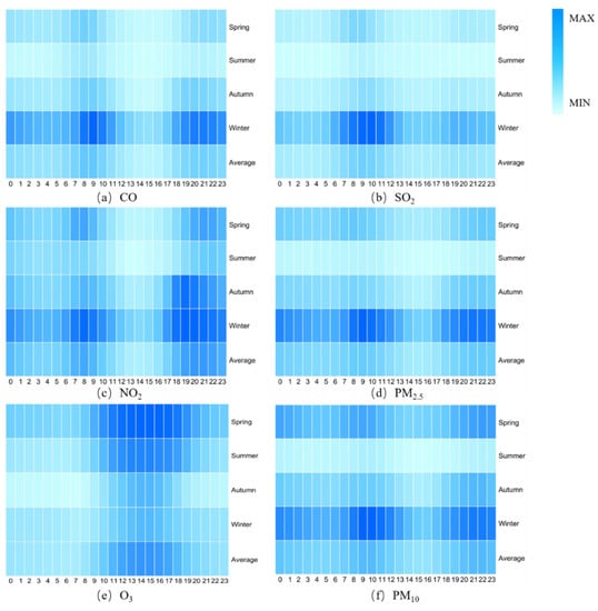 Figure 6 shows the seasonal changes in the concentrations of six pollutants in the eastern region of Jilin Province from 2015 to 2020. We can see from the figure that the seasonal variation of pollutant concentration in the study area is very significant. Except for O3 pollution, which was the most serious in spring, the concentration of the other five pollutants was the highest in winter. The highest concentration of pollutants occurred at 7:00–10:00 and 18:00–21:00. Overall, O3 pollution was the most serious in spring, followed by summer. O3 pollution in autumn and winter was significantly lower than that in other seasons. The lower O3 concentration in winter might be since the radiation level in winter was lower than in other seasons. The lack of light and low temperature in winter was not conducive to O3 formation, while a large amount of O3 was generated when the solar radiation increased in spring [].