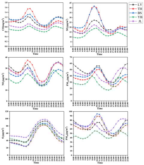 To further analyze the hourly variation trend of pollutants, we separated 16 monitoring stations according to cities to explore the hourly variation. This study used the mass concentrations of six conventional pollutants from 2 January 2015, to 31 December 2020, from 16 air quality monitoring stations. The results are shown in Figure 7.