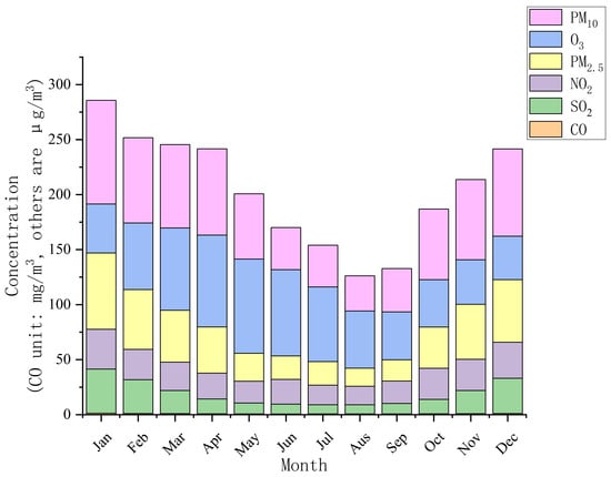 The concentration stack diagram is used to describe the contribution of six pollutants to pollution in other months. The results are shown in Figure 8. Through the superposition of absolute concentrations of contaminants, we intuitively found that the monthly breakdown in the study area presented a “U” distribution. The pollution was most serious in January, followed by February, March, April, and December, and less so in July, August, and September. Except for O3, the monthly concentrations of the other five pollutants were consistent with the total pollution trend, showing a “U” distribution.