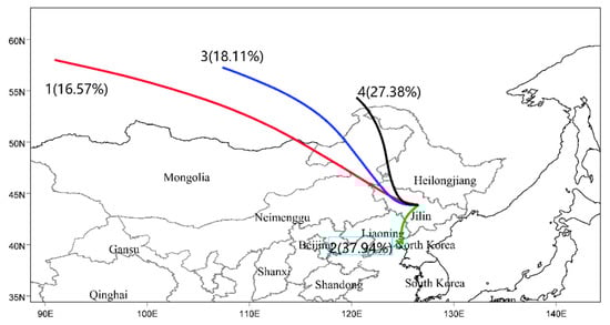 Figure 10 shows the trajectory clustering results of four spring, summer, autumn, and winter seasons in eastern Jilin Province in 2019. We found that the trajectory had prominent seasonal characteristics. The clustering results in spring and autumn were similar to those in the whole year, mainly affected by the long-distance transmission in Northwest China and the short-distance transmission in Southwest China. The trajectory cluster in summer was the most special in the four seasons. In addition, the northwest cluster (Russia–Mongolia–Inner Mongolia) was also affected by the southeast ocean circulation, accounting for 8.7%. In summer, the trajectory from the southwest was the Yellow Sea Liaoning sea–land breeze circulation, accounting for 51.47%. The more complex airflow in summer might provide great help for the dilution of pollutants, resulting in the generally low concentration of contaminants in summer. In winter, it was mainly affected by long-distance transportation in the northwest (Russia–Mongolia–Inner Mongolia), and the track transmission distance was the longest, accounting for 47.71%.