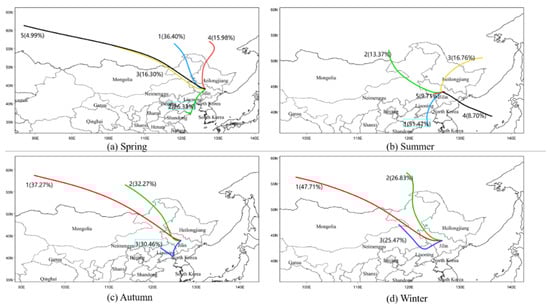 The trajectory clustering results of four spring, summer, autumn, and winter seasons in eastern Jilin Province in 2019. In (a), the trajectories are divided into five clusters: cluster 1 is in blue; cluster 2 is in green; cluster 3 is in yellow; cluster 4 is in red; cluster 5 is in black. In (b), the trajectories are divided into five clusters: cluster 1 is in blue; cluster 2 is in green; cluster 3 is in yellow; cluster 4 is in black; cluster 5 is in red. In (c,d), the trajectories are divided into three clusters: cluster 1 is in red; cluster 2 is in green; cluster 3 is in blue.