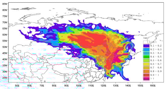 At the same time, the potential source area of PM2.5 was verified again using concentration-weighted trajectory (CWT) []. The difference between CWT and PSCF is that PSCF uses a concentration threshold to evaluate the potential source of PM2.5. This means that when the sample concentration is only slightly higher or much higher than the standard, its PSCF value may be the same. Therefore, it may not be able to distinguish between medium and potent sources. For the CWT method, the weighted concentration can be allocated by averaging the sample concentration with the relevant trajectory passing through the grid cell to overcome the limitation of PSCF. CWT is represented by Equation (3):