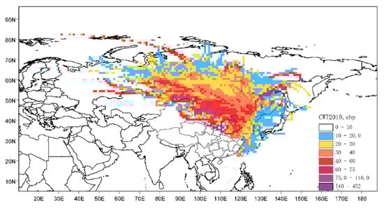 To identify the potential source areas of PM 2.5 and provide theoretical support for the regional joint treatment of air pollutants in the eastern part of Jilin Province, we implemented the potential source contribution function (PSCF) for PM 2.5 in this study. PSCF was calculated based on the concentration data of PM2.5 in 2019 []. PM2.5 limit concentration was taken from the secondary standard limit in ambient air quality standard (GB3905-2012), which is 75 μg/m3. PSCF is represented by Equation (1):