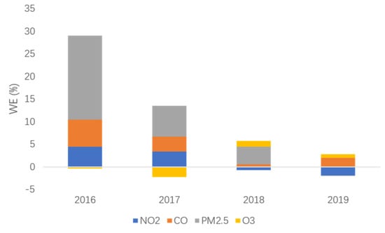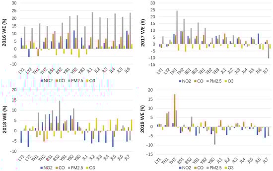 In the formula, and represent the weekend hourly mean concentration and working day hourly mean concentration of pollutants. This method has been adopted by many studies [,]. Weekends in this article were legal holidays stipulated by the State Council. In addition, other days were defined as working days. In this study, the average concentrations of CO, NO2, PM2.5, and O3 on weekends and working days at each station in 16–19 years were calculated, and we calculated the weekend effect. At the same time, the eastern part of Jilin Province was regarded as a whole to analyze the change in the weekend effect between years. If the WE value is positive, it indicates that the pollutant concentration on weekends is greater than that on weekdays, which is defined as a “positive weekend effect”. If the WE value is negative, it is defined as a “negative weekend effect”, and WE’s absolute value represents the intensity of the “weekend effect”.
