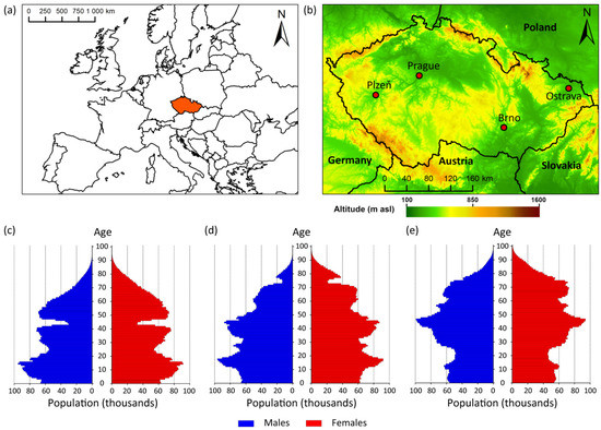 Location of the Czech Republic in Europe (a), physical geographical map of the Czech Republic (b), and age pyramids for 31 December 1961 (c), 31 December 1991 (d), and 31 December 2020 (e) (data in [64]).
