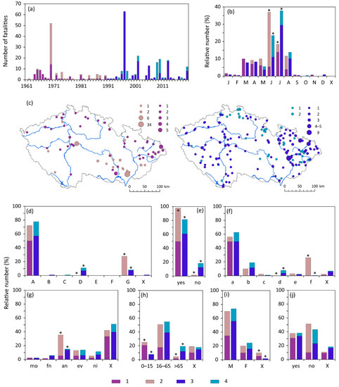 Characteristics of flood-related fatalities in the Czech Republic during the 1961–1990 (1—flood, 2—flash flood) and 1991–2020 (3—flood, 4—flash flood) periods. (a) Fluctuations in 1961–2020; (b) annual variation; (c) spatial distribution (seven fatalities in 1961–1990 and two fatalities in 1991–2020 lack exact locations); (d) cause of death; (e) type of fatality (direct); (f) place of death; (g) time of day; (h) age; (i) gender; (j) behaviour (hazardous). Symbols * identify statistically-significant differences (p < 0.05) in corresponding relative numbers between two 30-year periods in parts (b) and (d–j). Symbols and abbreviations: A—drowning, B–tree/branch fall, C—vehicle accident, D—underlying health reason, E—freezing to death/hypothermia, F—lightning strike, G—other reason; a—river/lake/reservoir/river bank, b—within a building, c—road, d—open space in a built-up area, e—open countryside, f—other places; mo—morning, fn—forenoon, an—afternoon, ev—evening, ni—night; M—males, F—females; X—unknown.