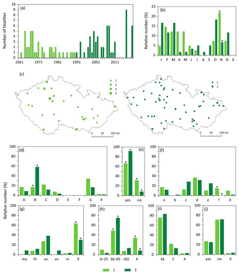 Characteristics of windstorm-related fatalities in the Czech Republic during the 1961–1990 (1) and 1991–2020 (2) periods. (a) Fluctuations in 1961–2020; (b) annual variation; (c) spatial distribution (one fatality in 1961–1990 and two fatalities in 1991–2020 lack exact location); (d) cause of death; (e) type of fatality (direct); (f) place of death; (g) time of day; (h) age; (i) gender; (j) behaviour (hazardous). For an explanation of symbols and abbreviations see Figure 2.
