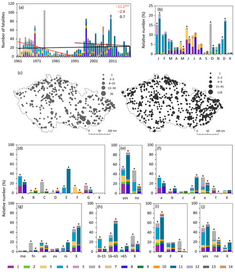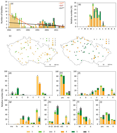 Characteristics of fatalities associated with convective storms in the Czech Republic during the 1961–1990 (1—lightning strike, 2—strong wind, 3—during a thunderstorm) and 1991–2020 (4—lightning strike, 5—strong wind, 6—during a thunderstorm) periods. (a) Fluctuations with linear trends (top right in fatalities/10 years for both 30 years and 1961–2020, trends with ** are significant for p < 0.05 and with * for p < 0.10); (b) annual variation; (c) spatial distribution (20 fatalities in 1961–1990 lack exact location); (d) cause of death; (e) type of fatality (direct); (f) place of death; (g) time of day; (h) age; (i) gender; (j) behaviour (hazardous). For an explanation of symbols and abbreviations see Figure 2.