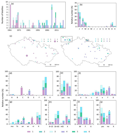 Characteristics of fatalities associated with snow and glaze ice in the Czech Republic during the 1961–1990 (1—snow, 2—avalanche, 3—glaze ice) and 1991–2020 (4—snow, 5—avalanche, 6—glaze ice) periods. (a) Fluctuations in 1961–2020; (b) annual variation; (c) spatial distribution (two fatalities in 1991–2020 lack exact location); (d) cause of death; (e) type of fatality (direct); (f) place of death; (g) time of day; (h) age; (i) gender; (j) behaviour (hazardous). For an explanation of symbols and abbreviations see Figure 2.