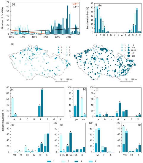 A greater proportion of fatalities belonged to the category “other reasons”, such as deaths in avalanches, a great amount of snow falling from a roof, a slip on snow or glaze ice on the street or road and subsequent fall, etc. (61.7% and 76.6%); significantly different were the proportions of deaths in “transport accidents” (31.9% in 1961–1990) and “underlaying health reasons” (19.1% in 1991–2020) (Figure 5d). More than half of the associated fatalities were classified in the “direct” category (61.7%) in the second period compared to the “indirect” category (53.2%) in 1961–1990 (Figure 5e). Fatalities were often recorded in the open countryside (44.7% in 1961–1990, while a maximum of 31.9% in 1991–2020 was also reached in “other places”—Figure 5f). Information about time of day of death is biased by a high proportion of unknown cases (48.9% and 38.3%), but 25.5% of deaths occurred at night during the first 30 years, and the same proportion in the afternoon during the second 30 years, with statistically significant differences in both cases (Figure 5g). Adults predominated in both periods (42.6% and 55.3%, but with 40.4% being of unknown age in 1961–1990—Figure 5h) as well as males in the gender category (53.2% and 72.3%—Figure 5i). While in 1961–1990 hazardous behaviour by the fatalities dominated the non-hazardous (68.1% to 29.8%) category, in 1991–2020 it was the opposite (46.8% to 53.2%); differences in non-hazardous proportions were statistically significant (Figure 5j).