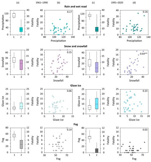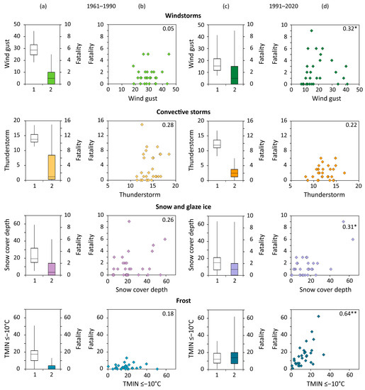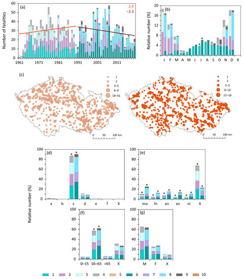 Fatalities in each category of fatal weather events were analysed separately for the 1961–1990 and 1991–2020 periods using their annual numbers, complemented with linear trends and their significance, distribution (variation) during the year, spatial distribution over the CR territory and particular features including the cause of death, type of fatality, place of death, time of death, age, gender, and behaviour (Figures 2–6). The same analysis was performed for all weather categories together (Figure 7) and separately for fatalities in vehicle accidents (Figure 8). The presence of a significant linear trend (p < 0.05 or p < 0.10) in the analysed time series was evaluated using the non-parametric Mann-Kendall test [67,68]. Parameters of linear trends were estimated applying the non-parametric Theil-Sen method, which is more robust to outliers in time series [69,70]. Linear trends in related figures for any of the 30-year or 60-year periods were marked only in the case that their slopes were equal to zero. The two-proportion Z-test [71] was used to test the significance of differences in relative proportions of fatalities in annual distributions and in their special characteristics between the 1961–1990 and 1991–2020 periods. In the case that they were statistically significant, related pairs of figures were marked by asterisks. Relationships between different fatality categories to corresponding climate variables in two standard 30-year periods were expressed by box plots and scatter plots, being complemented by the calculation of the non-parametric Spearman rank correlation coefficient with the p-value calculated via the asymptotic t-approximation (Figures 10 and 11).