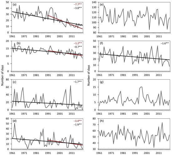 - Frost days (TMIN < 0.0 °C), days with TMIN ≤ −5.0 °C and with TMIN ≤ −10.0 °C—133 stations.