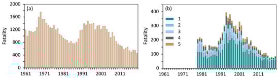 The numbers of flood fatalities in the CR significantly increased between 1961–1990 and 1991–2020, from 130 to 217 deaths. The related numbers of flash flood fatalities reached 65 (50.0% of all flood fatalities) and 58 (26.7%) respectively. Differences in the relative proportions of flash floods between 30-years periods are statistically significant (as well as for the remaining floods). The years 1970 with 52 fatalities and 1997 with 63 fatalities appeared as outstanding during the entire period analysed (Figure 2a). In the first case these were caused by the tragic flash flood of 9 June 1970 at Šardice, in southern Moravia, when a lignite mine collapsed due to a water torrent (34 fatalities). In the second case, they were related to the disastrous rainy flood of July 1997 (61 fatalities) in Moravia and Silesia [60]. As for other years, related annual deaths did not exceed 10 fatalities during 1961–1990, but in the following 30-year period fatalities reached 22 in 2002 (17 deaths during the disastrous August flood [72]) and fatalities above 15 also occurred in 2009, 2010, and 2013 (cf. Table A1).