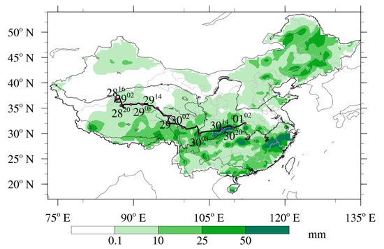 At 16:00 on 28 June 2016 (Beijing standard time, BST, the same as below), a TPV is generated in the south of Bayingol, Xinjiang, and Figure 1 shows the path of this TPV case. Obviously, it moves southeastward out of the TP at 08:00 on 30 June, further shifts eastward crossing Sichuan, Chongqing, and the middle reaches of the Yangtze River, and finally arrives at Xiangyang, Hubei on 1 July. The lifespan of the TPV is up to 58 h with an average moving speed of 14.1 m s−1, which is relatively faster compared to the climatological moving speed of TPVs [26]. This TPV case keeps active on the TP for about 40 h, generating little-to-moderate precipitation. More precipitation occurs in Sichuan, Chongqing, and the middle reaches of the Yangtze River when TPV moves off the TP.