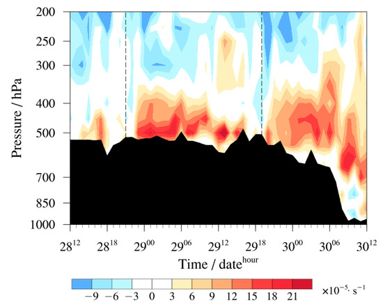 To get insight into the vertical structure of the TPV, the time-height section of the relative vorticity along the center of the TPV is given in Figure 2. It clearly shows that the intensity of the vorticity varies considerably with time, and can easily be divided into three stages. The first stage is from 12:00 on 28 to 23:00 on 28 June, when the TPV is located in western TP with a weak vorticity center near the source region of the TPV. The TPV then moves eastward to the central part of the TP and rapidly becomes much stronger in the second stage, from 23:00 on 28 to 20:00 on 29 June. The positive vorticity region extends upward to 350 hPa, with big value center (more than 18 × 10−5 s−1) at 400–500 hPa, indicating that TPV becomes deeper in this stage. In fact, the intensity of the TPV fluctuates, and is relatively weak in the late of this stage. During the third stage (20:00 on 29 to 08:00 on 30 June), TPV becomes strengthened again, with positive vorticity extending to 250 hPa before moving off the TP. Therefore, it can be seen that the evolutions of the TPV over the TP have distinct stages, with a fluctuating intensity of the TPV, including the generation stage, development stage and pre-moving-off stage. Additionally, the peaks of the TPV vorticity occur at night, which may be related to the daily variation in thermal conditions over the TP [27].