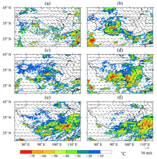 To further explore the evolution of TPV at the different stages, Figure 3 displays the distributions of the atmospheric circulation at 500 hPa isobaric surface and the TBB at six epochs (every two epochs per stage). From Figure 3, we can see that in the generation stage, the TP is controlled by an anticyclonic circulation of 500 hPa at 16:00 on 28 June (Figure 3a,b). Then, the anticyclonic circulation retreats to the southeastern TP at 00:00 on 29 June. In parallel, a cyclonic circulation appears in the western TP. Then a TPV is formed, with a convective cloud appearing on its southeast edge. Both the intensity and horizontal scale of the TPV are relatively weak at the first stage. For the second stage (Figure 3c,d), the TPV moves eastward to the central TP at 08:00 on 29 June, with the cyclonic circulation intensifying and convective cloud weakening. At 20:00 on 29 June (Figure 3d), the TPV continues to move eastward and gradually becomes strengthened, especially with a stronger convective cloud to the south of the TPV, which appears to be the peak of TPV’s development over the TP. From Figure 3e (pre-moving-off stage), we can see that TPV now is located in the eastern TP. The cyclone circulation is weakened, and the large value center of the convective cloud has moved away from the TP, indicating that the activity of the TPV over the TP is coming to an end. Until 12:00 on 30 June, the TPV completely moves out of the TP (Figure 3f).