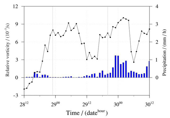 Time series of the 500 hPa relative vorticity averaged over the 2° × 2° grid surrounding the TPV center (lines, unit: 10−5 s−1), and precipitation averaged over the area shown in the red box in Figure 3 (bars, unit: mm·h−1) from 12:00 on 28 to 12:00 on 30 June 2016 (the gray dashed line is the boundary of the three stages).
