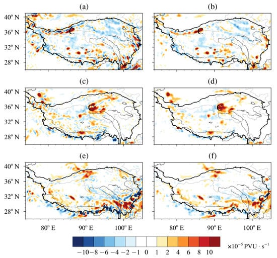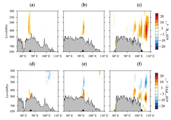 Figure 6 presents the longitude–altitude profile of the diabatic heating and PV1 along the TPV center. In the generation stage, positive diabatic heating exists around the TPV center with a maximum near 350 hPa (Figure 6a), but the PV is weak at this stage (Figure 6d). In the development stage, diabatic heating mainly appears below 300 hPa with no marked changes in value and a maximum center; resulting in a large vertical gradient and further forming a positive PV1 area below 350 hPa, and a negative PV1 area above 350 hPa (Figure 6e), according to Equation (1). And this favors to the development of low-level cyclonic circulation and high-level anticyclonic circulation, favoring the development and enhancement of the TPV to some extent. In the pre-moving-off stage (Figure 6c,f), the diabatic heating over the TP obviously enhanced, corresponding to the stronger PV1 at a lower and higher level. At this stage, the maximum of diabatic heating is mainly located at the eastern part of the TP (105° E–110° E). Therefore, the diabatic heating has a great influence on the intensity and moving direction of the PV [28], which is also favorable for the TPV developing and moving eastward out of the TP.