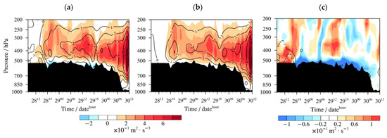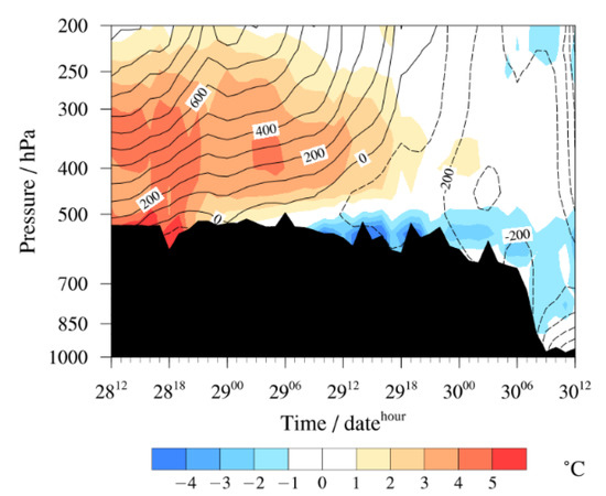 There is a large positive value of temperature local variation term (Figure 7c) at 400–500 hPa in generation stage comparing with that in the development stage and pre-moving-off stage. Importantly, this local positive temperature center occurs 1–3 h earlier than the generation of the TPV (16:00 on 28 June). Meanwhile, the local variation term of water vapor is negative, indicating that the evaporation is greater than the condensation at this time. Thus, the increase in local temperature is probably due to surface sensible heating instead of the latent heat of condensation. Additionally, the local variation of near-surface temperature is negative after 00:00 on 29 June (Figure 7c), while the lower atmosphere is relatively cold (Figure 8). This may be due to precipitation and development of the convective cloud system [29,30], which leads to the decrease in net radiation and the reduction in surface temperature.
