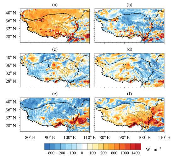 Figure 9 shows the distributions of the vertically integrated atmospheric apparent heat source <Q1> and apparent moisture sink <Q2> during these three stages. In the generation stage, <Q1> is positive on the whole TP (Figure 9a), while <Q2> is negative in most areas of the TP, except the region near the TPV (Figure 9b). In general, <Q1> is composed of surface sensible heating, latent heat of condensation and radiation heating, of which radiation heating is of little importance. At the same time, <Q2> mainly reflects the role of latent heat of condensation. Therefore, the surface sensible heating is the main contribution term of <Q1> at this first stage. In the development stage and pre-moving-off stage, the center of <Q1> is located to the east of the TPV center and is significantly enhanced (Figure 9c,e). The distribution of <Q2> is similar to <Q1>, but with bigger positive area expands significantly, indicating that the latent heating term is the main contribution of the atmospheric heat source after the TPV being formed and becoming stronger.