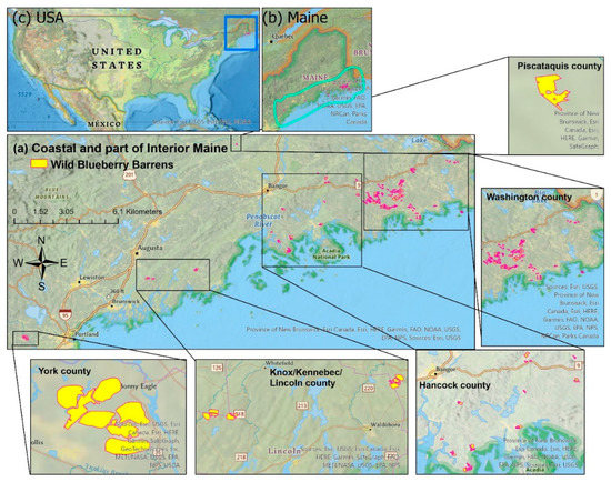 Locations of the studied wild blueberry barrens in different counties from north-central (Piscataquis) and north-east (Washington, Hancock) to south-west (Knox, Lincoln, Kennebec, York) at the (a) coastal and interior climate regions of (b) Maine at the north-east of (c) the United States of America. The yellow-colored polygons with pink-colored boundaries indicate the studied wild blueberry barrens (WBBs) (area of each barren ≥ 0.5 km2). Different counties and climate regions of Maine are shown in Figure S1 in the supporting materials of this study.