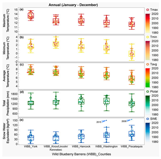 Comparison of historical (1980 to 2020) annual climate parameters: (a) maximum temperature, (b) minimum temperature, (c) average temperature, (d) total precipitation, and (e) snow water equivalent among the studied wild blueberry barrens (WBBs) in different counties from north-central (Piscataquis) and north-east (Washington, Hancock) to south-west (Knox, Lincoln, Kennebec, York) of Maine as shown in Figure 1.