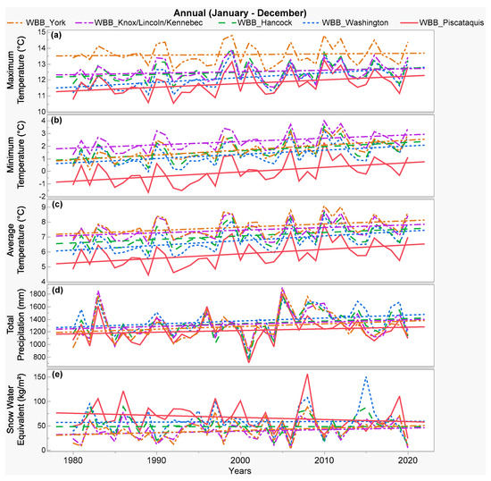 Historical (1980 to 2020) changes with fitted linear regression trendlines for the annual climate parameters: (a) maximum temperature, (b) minimum temperature, (c) average temperature, (d) total precipitation, and (e) snow water equivalent throughout the studied wild blueberry barrens (WBBs) in different counties from north-central (Piscataquis) and north-east (Washington, Hancock) to south-west (Knox, Lincoln, Kennebec, York) of Maine as shown in Figure 1.