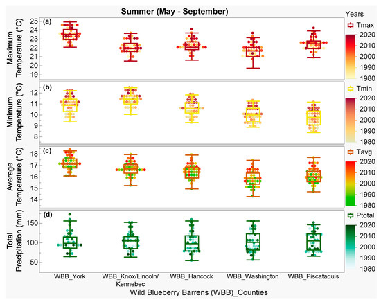 Comparison of historical (1980 to 2020) summer climate parameters: (a) maximum temperature, (b) minimum temperature, (c) average temperature, and (d) total precipitation among the studied wild blueberry barrens (WBBs) in different counties from north-central (Piscataquis) and north-east (Washington, Hancock) to south-west (Knox, Lincoln, Kennebec, York) of Maine as shown in Figure 1.