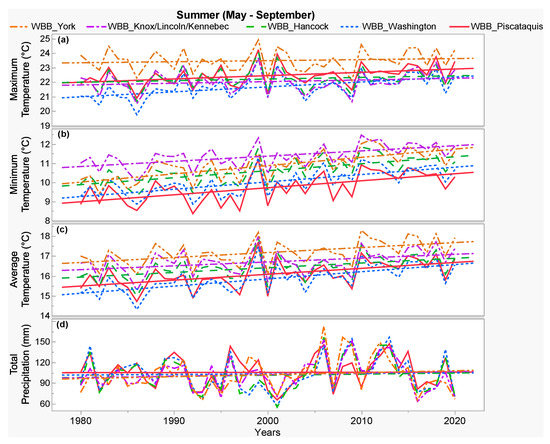 Historical (1980 to 2020) changes with fitted linear regression trendlines for the summer climate parameters: (a) maximum temperature, (b) minimum temperature, (c) average temperature, and (d) total precipitation, throughout the studied wild blueberry barrens (WBBs) in different counties from north-central (Piscataquis) and north-east (Washington, Hancock) to south-west (Knox, Lincoln, Kennebec, York) of Maine as shown in Figure 1.