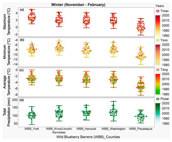 Comparison of historical (1980 to 2020) winter climate parameters: (a) maximum temperature, (b) minimum temperature, (c) average temperature, and (d) total precipitation among the studied wild blueberry barrens (WBBs) in different counties from north-central (Piscataquis) and north-east (Washington, Hancock) to south-west (Knox, Lincoln, Kennebec, York) of Maine as shown in Figure 1.