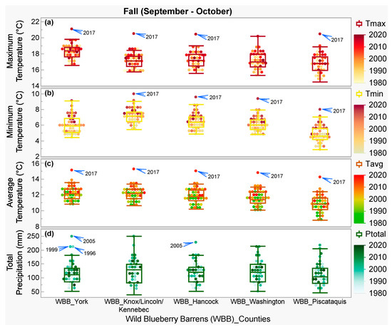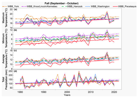 Historical (1980 to 2020) changes with fitted linear regression trendlines for the fall climate parameters: (a) maximum temperature, (b) minimum temperature, (c) average temperature, and (d) total precipitation, throughout the studied wild blueberry barrens (WBBs) in different counties from north-central (Piscataquis) and north-east (Washington, Hancock) to south-west (Knox, Lincoln, Kennebec, York) of Maine as shown in Figure 1.
