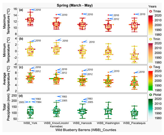 Comparison of historical (1980 to 2020) spring climate parameters: (a) maximum temperature, (b) minimum temperature, (c) average temperature, and (d) total precipitation among the studied wild blueberry barrens (WBBs) in different counties from north-central (Piscataquis) and north-east (Washington, Hancock) to south-west (Knox, Lincoln, Kennebec, York) of Maine as shown in Figure 1.