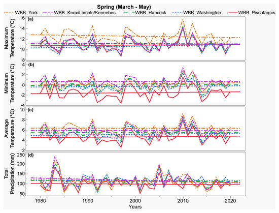 Historical (1980 to 2020) changes with fitted linear regression trendlines for the spring climate parameters: (a) maximum temperature, (b) minimum temperature, (c) average temperature, and (d) total precipitation, throughout the studied wild blueberry barrens (WBBs) in different counties from north-central (Piscataquis) and north-east (Washington, Hancock) to south-west (Knox, Lincoln, Kennebec, York) of Maine as shown in Figure 1.
