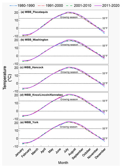 Annual average temperature cycle for the periods of 1980–1990, 1991–2000, 2001–2010, and 2011–2020 (represented by 4 lines of different colors and styles) in the studied wild blueberry barrens (WBBs) in (a) Piscataquis, (b) Washington, (c) Hancock, (d) Knox/Lincoln/Kennebec, (e) York counties of Maine as shown in Figure 1. Dotted black lines indicate 32 °F (0 °C) and 55 °F (12.8 °C). Approximate last spring frost and first fall frost dates based on the 32 °F (0 °C) line, and growing season period based on the 55 °F (12.8 °C) line, are further detailed in Table 3.