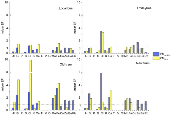 Figure 2 presents the indoor EF ratios of the different vehicles in 2014. In most cases, the indoor EF values were approximately 1, as expected. Nevertheless, some elements had higher values. In the buses, the indoor EF values were all approximately 1 for both fractions, suggesting that the pollutants originated from outside. Chlorine had the highest indoor enrichment in the trolleybuses and old and new types of trams. In the fine fraction, the source of chlorine was assumed to be sodium hypochlorite, which is used to clean the interior of vehicles. The origin of the coarse fraction of Cl is a question to which single particle analysis by SEM could provide answers. The indoor EF of zinc was above 1 in the trolleybuses and the two trams; it could originate from the overhead wires. Moreover, high iron and silicon values were identified in the trams. The most probable source of iron could be the rail and tram wheel abrasion.