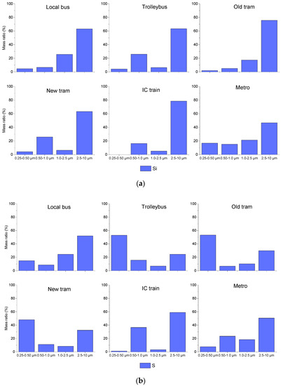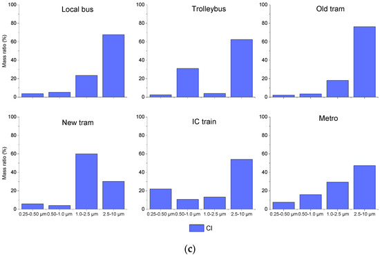 The mass size distributions of three selected elements are shown on Figure 3. Silicon (Figure 3a) represents the crustal elements, sulphur is representative of anthropogenic elements of outdoor origin and chlorine is the element with an indoor source. The size distribution of all of the elements can be found in Supplementary Materials Figure S3. In the mass size distribution of the Earth’s crust elements, the main peak appeared in the coarse fraction, as was expected. In the case of sulphur (Figure 3b), the distribution had a bimodal shape in most cases. One peak could be found in the condensation mode (0.25–0.50 µm) and another in the coarse mode. The mass size distribution of S in the trams and the trolleybuses showed similarity with a dominant peak in the condensation mode. The elevated PMcoarse concentrations could be responsible for the considerable peak in the coarse mode, especially in the case of the bus and the metro. In the IC train, the fine-mode S peak appeared in the droplet mode (0.5–1 µm). The IC train had a closed ventilation system, which could cause the shift in the size distribution. The mass size distribution of chlorine (Figure 3c) differed from vehicle to vehicle. Most of the Cl could be found in the coarse mode; however, in specific vehicles, considerable amounts of Cl were found in the 1–2.5 µm size fraction. One possible source of Cl is from the cleaning of the vehicles. However, it does not explain the very high concentrations in the coarse mode. The Metro carriage showed different features, which was expected due to the fact of its specific microenvironment.