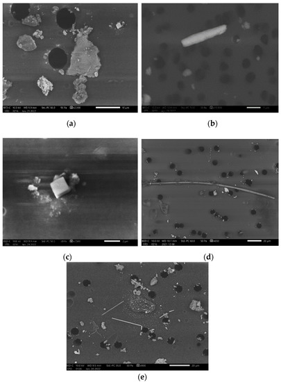 The determined particle types by scanning electron microscopy: (a) Al-, Si-, K- and Mg-rich amorphous particles (old tram, 2012); (b) Fe-rich filings (Metro, 2014); (c) cubic NaCl particle (old tram, 2012); (d) fibrous C–O-rich particle (IC train, 2014); (e) K-rich fibers (old tram, 2014).