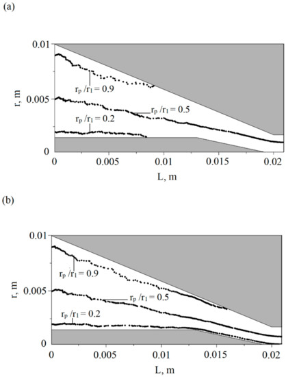On the contrary, the particles with a diameter of 10 nm can leave the charger without being lost to the wall due to the diffusion force not being enough to bring them close to the wall. The trajectories of the particles with a diameter of 5 nm also deviate from the streamline by a diffusion force and deposits on the wall of the external electrode. Compared with the trajectories of the 3 nm particles, it is found that 5 nm particles move for longer and their attachment positions are closer to the downstream area. In the case of particles introduced close to the centerline (rp/r1 = 0.5), three particle sizes leave the charger without adherence to the wall. It is seen that 3 nm particle trajectories drift more significantly in the early stage than the other two particles. When they reach the downstream region, the Brownian motion mechanism of the particles reduces due to the acceleration of the airflow, and the particle trajectories gradually tend to the corresponding streamline.