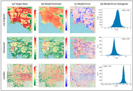 The model clearly captured patterns in the spatial distribution of NO2, which are largely affected by local sources, such as traffic, as seen in the results (Figure 3). However, the model underestimates highly polluted roads, and overestimates green areas with very low pollution—similar to the PM2.5 model results. Although London city center is well captured by the model, its surrounding road networks are underestimated to a level of 15 µg/m3. This may reflect the greater proportion of diesel vehicles and higher levels of congestion in London compared to the other training cities [41]. LA and Vancouver show better results with more evenly distributed model residuals.