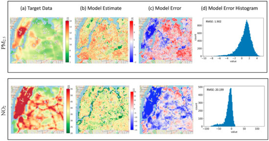 The existing literature on satellite-based AQ estimation incorporates many variables in the modeling scheme, including meteorology, traffic, topography, and distance from emission source [15,16,18]. The model by [46] reported 36% explained variation in PM2.5 in NYC, with a coarser (kilometer-scale) spatial resolution. Other models reported a PM2.5 prediction RMSE of 3.1 µg/m3 in the LA region [47], and PM2.5 (NO2) hourly prediction RMSE of 6.7 (43.5) µg/m3 in London [48]. Our model results, trained and validated on modeled LUR data, improve current modeling efforts in all study areas (Table 3). The models exhibit reduced error and produce high-spatial-resolution predictions, while significantly decreasing the amount of input datasets required.