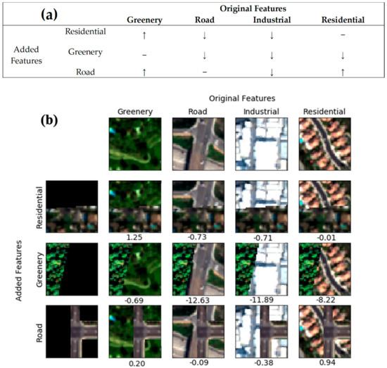 We started by randomly selecting different images that have urban features consisting of greenery, road, industrial and residential objects. Then, we synthesized satellite images with urban features associated with low and high pollution levels (i.e., artificially adding image features over existing images) with examples in Figure 6b. Each row/column in Figure 6b represents an urban feature category and the intersection of each row and column shows a synthesized image combining those features. The differences between pollution concentrations of original and synthesized images predicted by the model are indicated on the right hand of each subplot in Figure 6b. We fed the original and synthesized images into the trained model and analyzed the difference in pollution levels predicted by the model.